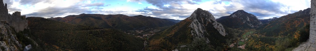 Previously, we were in southern France. In this photo, we looked across the season’s first changing leaves from an ancient peak that once sheltered “heretic” Christians from the sword.